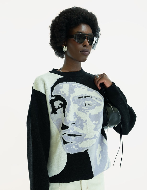 Ghost knitwear featuring exclusive seasonal print, this knit is from the painting “Ghost” by artist Mayssa Fakih. Ghost is inspired by how different versions of ourselves live within us and at any moment we can access these different versions. This other self may feel like an invisible entity within us that requires a bit more searching for, but can always be found. Crafted from a superior wool cotton blend. The knit is escpecially intricate, with each stitch carefully crafted to mimic the painting “ghost”, bringing the design to life. Cut to a relaxed unisex fit. The knit detrails add depth, making every inch of this sweater a representation of the meticulous effort and artistry involved in this creation.