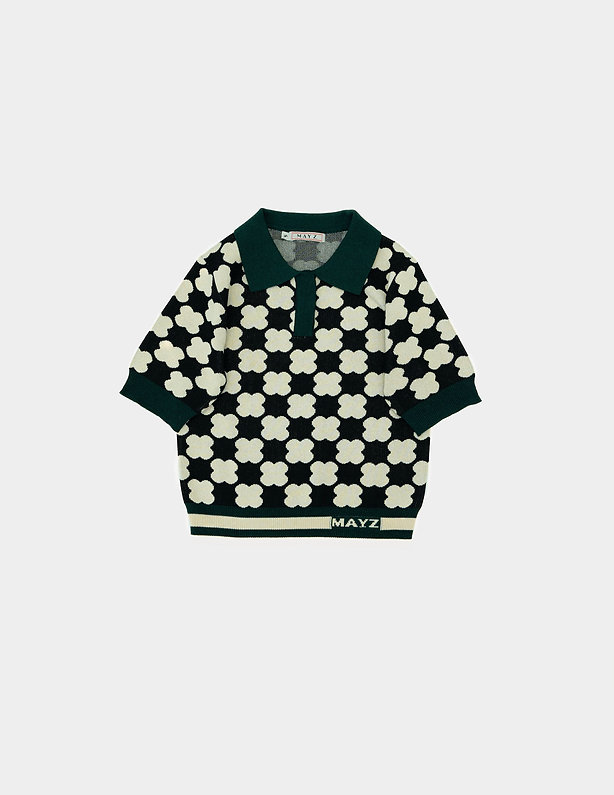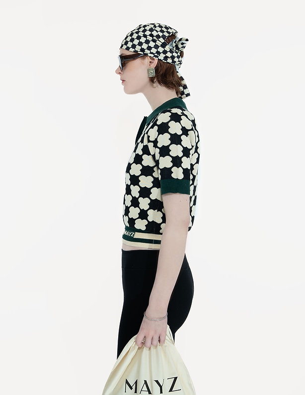Piazzo knit top highlights the signature piazzo print, cut to a fitted silhouette with short sleeves, and a cropped length. Crafted with a superior cotton wool blend, featuring a green crew collared neckline, green line detailing at the cuffs and bottom of the top. The dense knit texture of the top offers a luxurious feel and the custom bone buttons add a unique element to the top giving it a one of kind identity.